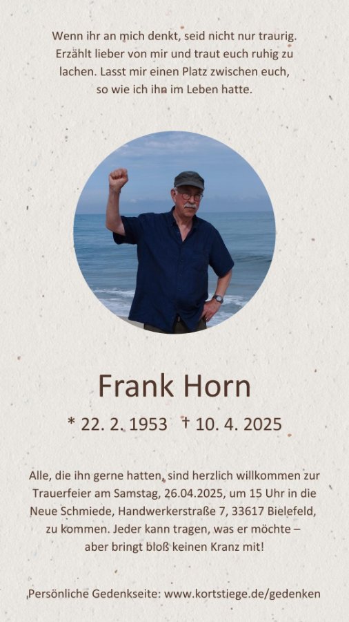 wir wünschen Ihnen für die kommende Zeit viel Kraft und dass es Ihnen gelingt, dankbar auf die positiven Erinnerungen zurückzublicken. Diese Gedenkseite möge Ihnen dabei helfen, Ihre Trauer zu teilen und das Andenken gemeinsam wachzuhalten.
